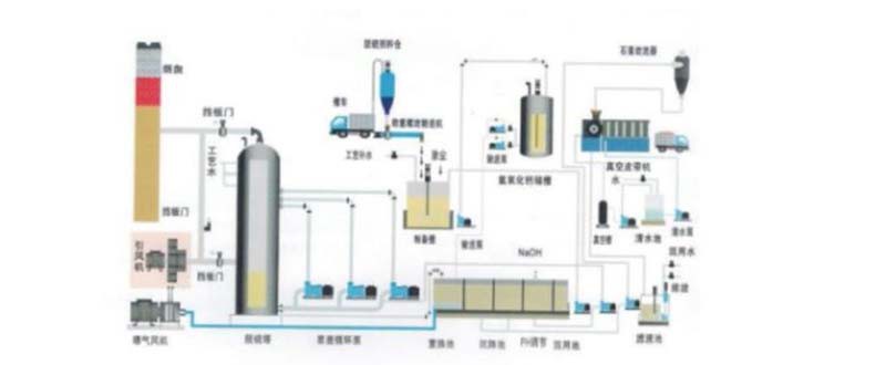 双碱法脱硫工艺,简称双碱法,是较常用的烟气脱硫法。钠钙双碱法采用火碱吸收SOz,石灰还原再生。再生后吸收剂循环使用,无废水排放。窑炉烟气经除尘器除尘后进入脱硫塔,并与脱硫液中的碱性脱硫剂在雾化区内充分接触反应,完成烟气的脱硫吸收。